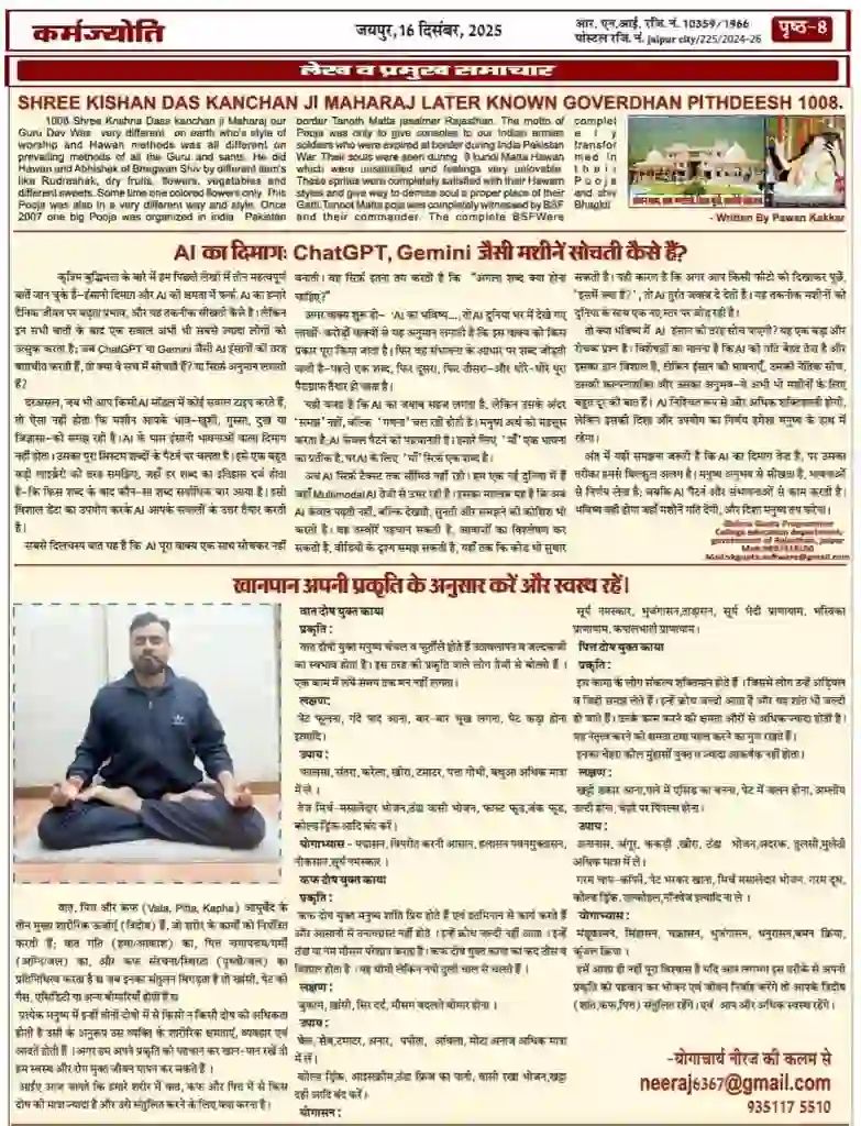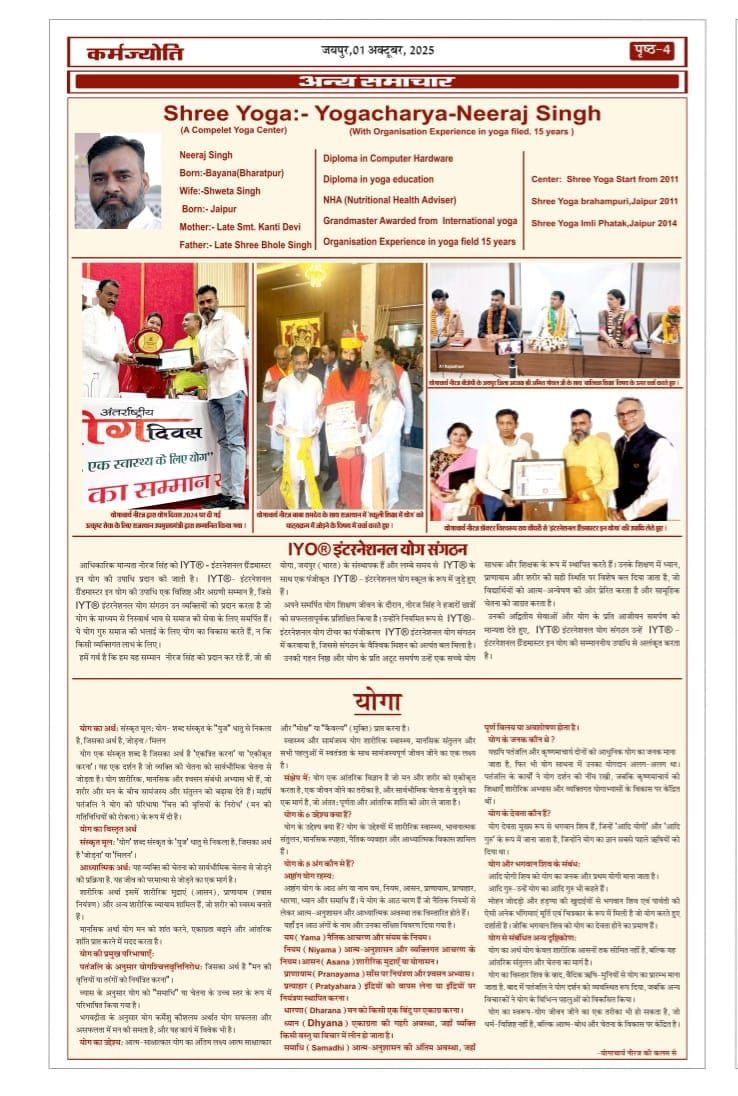 The owners of Shree Yoga IYT Grandmaster Neeraj Singh, being published into the ress release of Karma Jyoti Special Edition on 1st October 2025. Also special thanks to Suresh Pandey Editor of Karma Jyoti Special Edition. This recognition highlights the dedication and commitment of Shree Yoga to upholding the authentic teachings and standards established by the International Yoga Organisation while serving the Jaipur community with distinction.